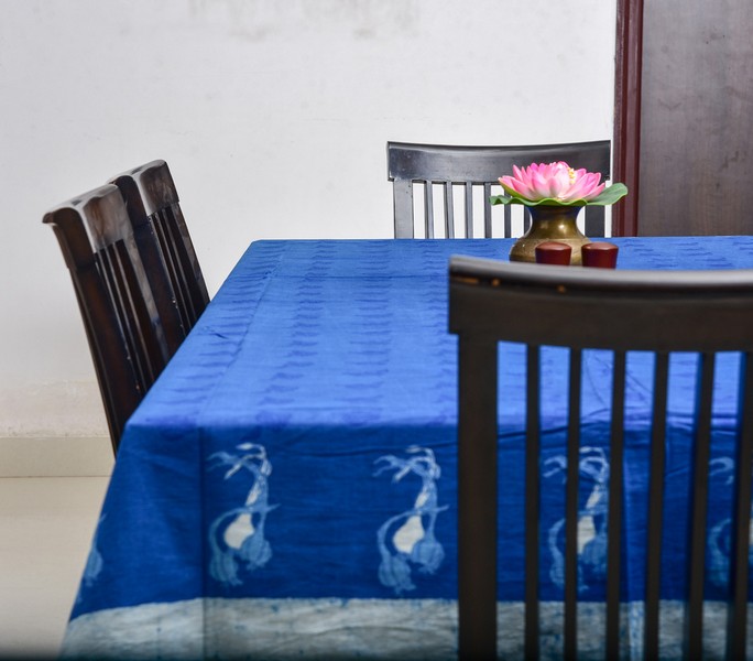 Indigo dyed cushions, mats, curtains, clothing, fashion accessories, tablecloths and napkins